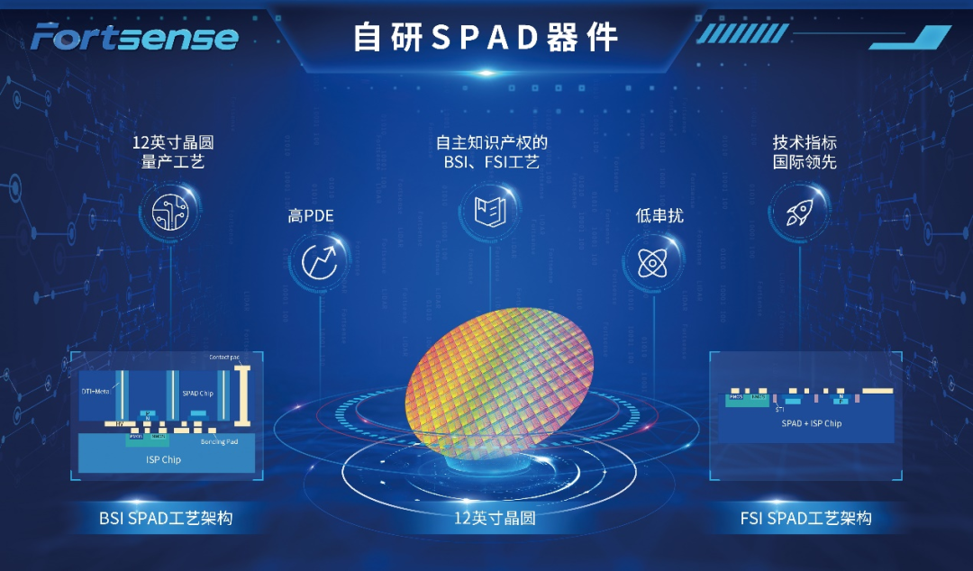 本輪融資的業(yè)務(wù)新看點(diǎn)在激光雷達(dá)SPAD芯片。2019年,「阜時科技」在完成3D結(jié)構(gòu)光和雙目的前期研發(fā)后,組建內(nèi)部研究院,布局激光雷達(dá)芯片研發(fā);2021年單點(diǎn)SPAD芯片投片成功;2022年,接到多家車企激光雷達(dá)廠商的定制合同,激光雷達(dá)接收傳感芯片正式通過AEC-Q102車規(guī)國際標(biāo)準(zhǔn)認(rèn)證,并開始批量交付。這款芯片以泛自動駕駛領(lǐng)域為應(yīng)用場景,近日已通過客戶驗證,預(yù)計在明年上車。