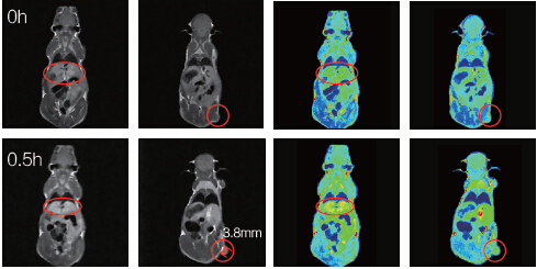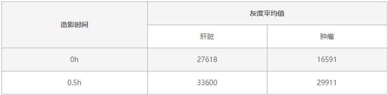 小鼠腫瘤直徑3.8mm;打入新型Mn螯合造影劑0.5h之后,通過灰度平均值計算,發(fā)現(xiàn)肝臟與腫瘤造影明顯。
