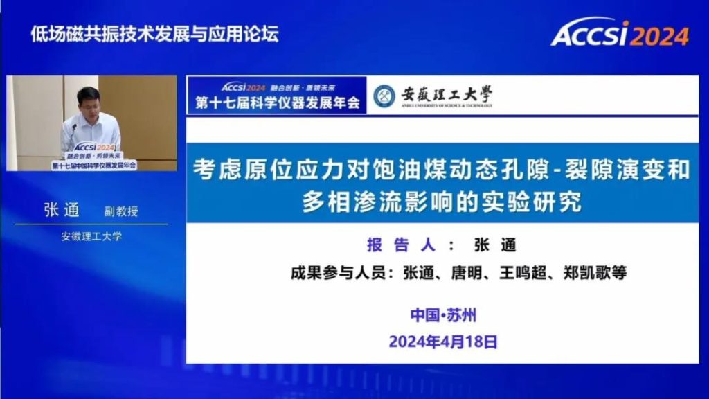 張通副教授分享了低場核磁技術在煤炭領域原位應力應變方向的應用,研究了油飽和煤中動態(tài)孔隙—裂縫演變和多相滲流的機理。