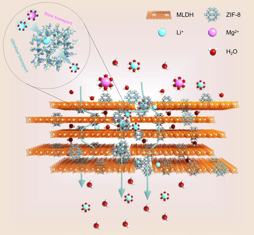 在這項(xiàng)應(yīng)用中,作者通過將功能性 ZIF – 8 納米粒子原位沉積到層狀雙氫氧化物(MLDH)膜中框架缺陷的納米孔中,獲得了具有高鋰離子(Li+)滲透性和出色穩(wěn)定性復(fù)合膜(ZIF – 8@MLDH)。