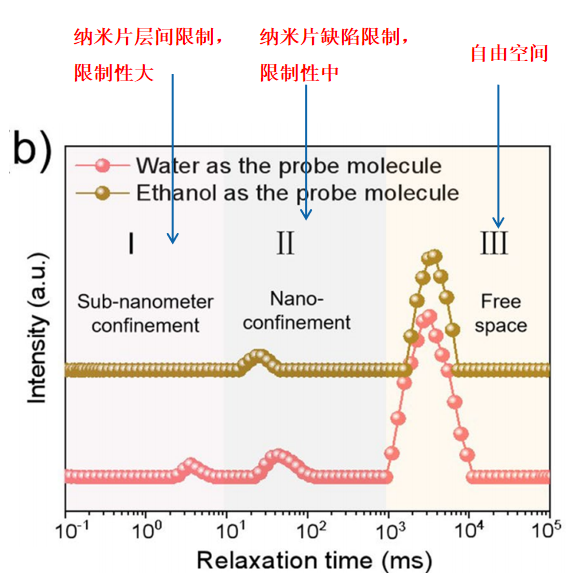該應(yīng)用用水或乙醇攜帶ZIF-8納米粒子做探針,表征二維材料的的微觀結(jié)構(gòu)。二維材料作為分離膜對物質(zhì)主要有三種作用,首先是納米片層之間的區(qū)域,該區(qū)域空間狹小且冗長,對探針的限制性很大,會(huì)導(dǎo)致物質(zhì)的弛豫時(shí)間非常短(0.1-10 ms);其次是納米片缺陷位置區(qū)域,該區(qū)域?qū)μ结樀南拗菩灾械?,弛豫時(shí)間在10 -103 ms范圍,最后是自由空間,探針在自由空間完全不受限制,弛豫時(shí)間較長(103-10?ms)。從圖1我們可以看出,代表納米片層間的0.1-10 ms時(shí)域內(nèi)未發(fā)生變化,說明ZIF-8納米粒子沒有沉積在二維材料層之間,